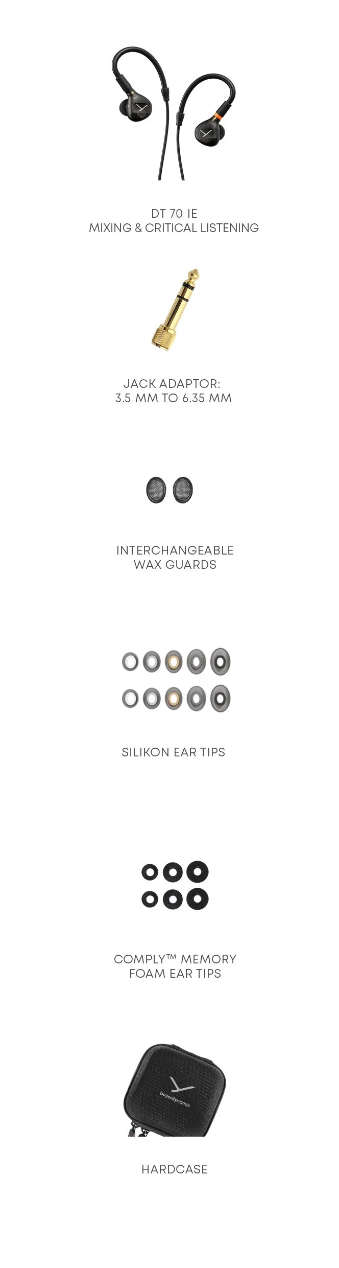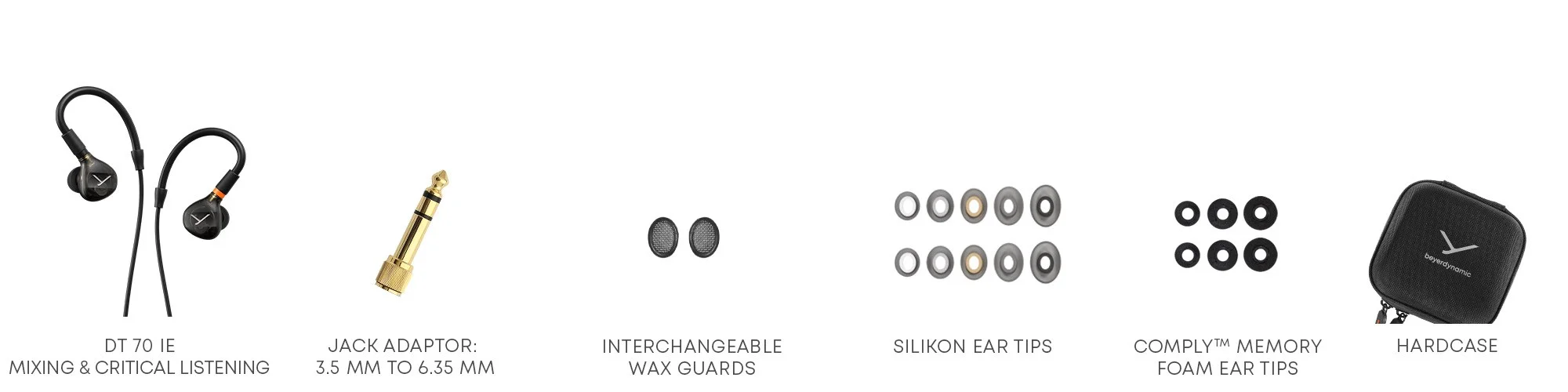 DT 70 IE – MIXING & CRITICAL LISTENING: Designed for live sound engineers, studio engineers, producers, and composers. Its linear sound signature adheres to the Fletcher-Munson curve, ensuring balanced playback at any volume. Ideal for precise mixing (live and in the studio), critical listening, and audiophile music enjoyment. DT 71 IE – DRUM & BASS: Optimised for drummers and bassists. Delivers powerful bass with pronounced highs for detailed cymbal and percussion playback, while recessed mids enhance transparency. DT 72 IE – GUITAR & VOICE: Perfect for singers and guitarists. Reduces the occlusion effect, slightly boosts mids, and delivers brilliant sound without harshness, making it ideal for vocals and guitars. DT 73 IE – CLASSIC INSTRUMENTS & KEYS: Tailored for string, wind, and keyboard instruments. Offers linear bass and mids with subtly boosted highs for natural, uncoloured sound fidelity.